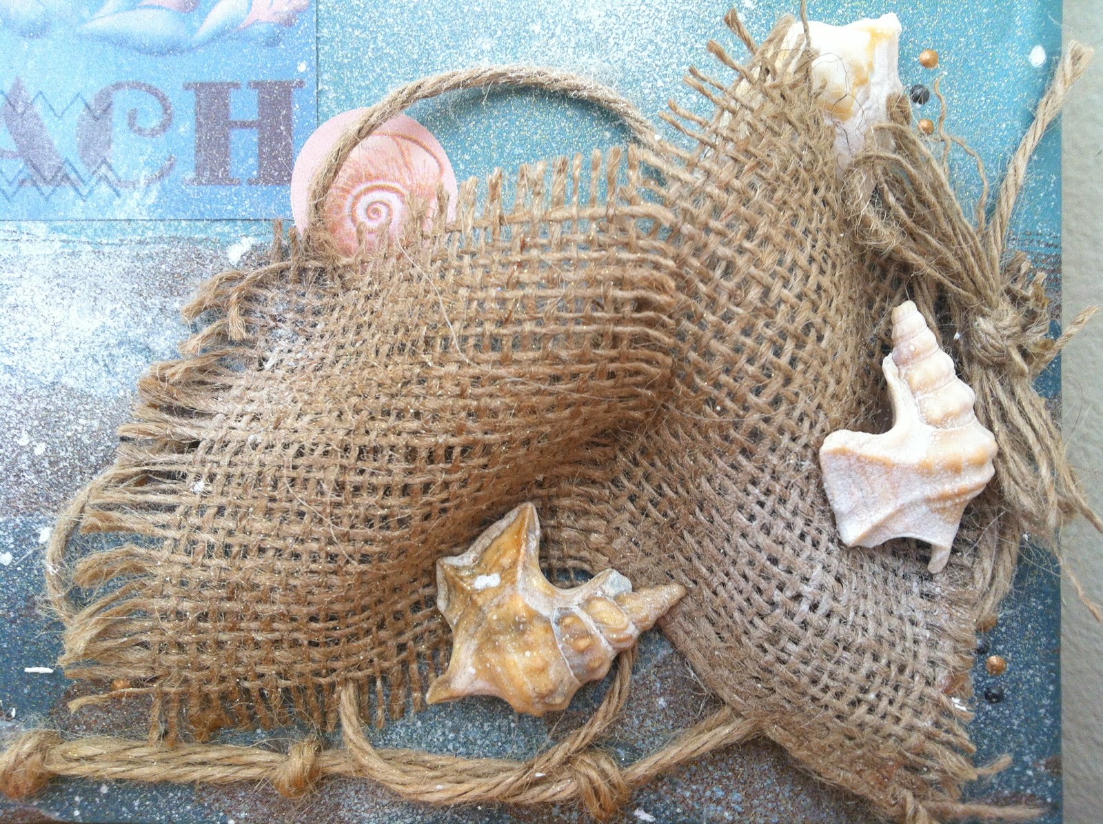 I covered the canvas with the single sheet of 12 x 12 paper and added elements from their sticker sheet. To give it some natural texture I added real shells and some burlap. The gel-a-tins Chevron clear stamp set reminded me waves and worked perfectly.